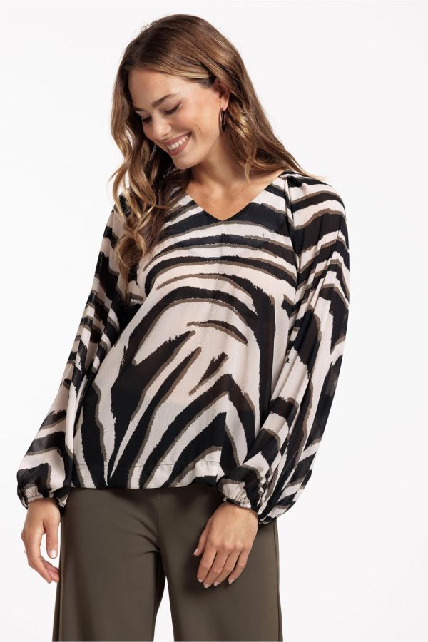 Voeg de Elain zebra crepe top toe aan je collectie en ontdek de veelzijdigheid en het comfort van dit stijlvolle item, perfect voor elke gelegenheid waarbij je wilt opvallen met een vleugje elegantie.